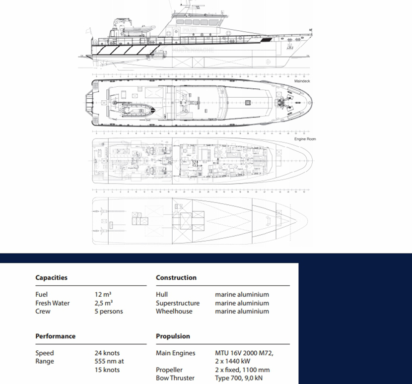 | 發(fā)動機功率: | 2 x 1440kW | 推進裝置: | 2 x fi xed, 1100 mm |