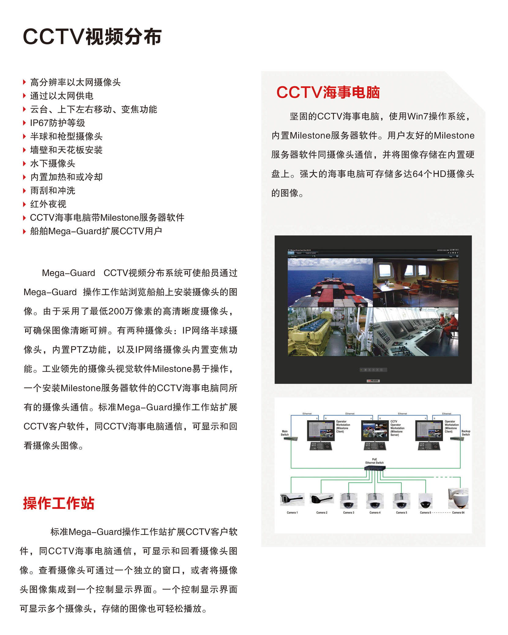 采用了最低200萬像素的高清晰度攝像頭,可確保圖像清晰可辦;兩種可選攝像頭-IP網絡半球攝像頭,內置PTZ功能/IP 網絡攝像頭,內置變焦功能;標準Mega- Guard操作工作站可擴展CCTV客戶軟件,與CCTV海事電腦通信,可顯示和回看攝像頭圖像
